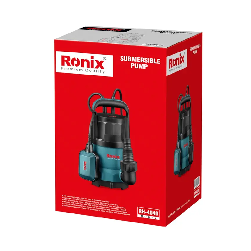 The RH-4040 model comes conveniently packaged in a Ronix color box alongside a few accessories. These accessories include a power cable that is 9m long and a floating switch. This switch senses the absence or presence of water and turns off the device’s motor when there is no water available, preventing the motor from running dry and damaging itself.