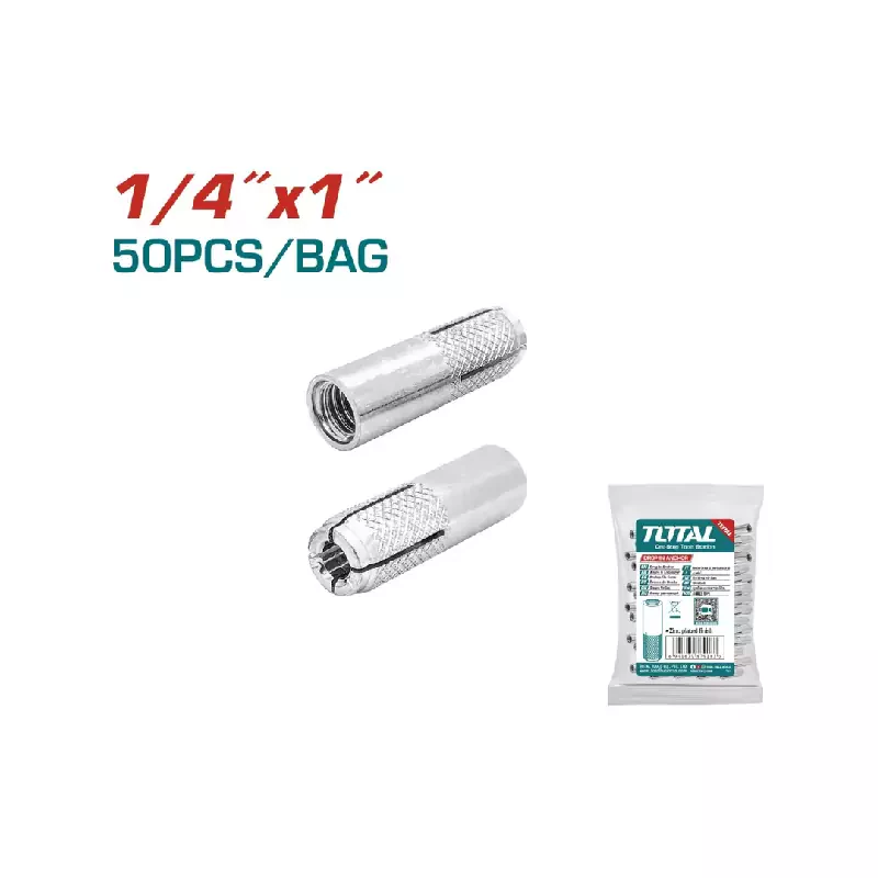 Specifications: Brand: Total Model: THWDA1411 Type: Drop-In Anchor Size: 1/4"x1" Qty: Pack of 50pcs Material: High quality carbon steel Zinc plated finish Packed in polyethylene bag