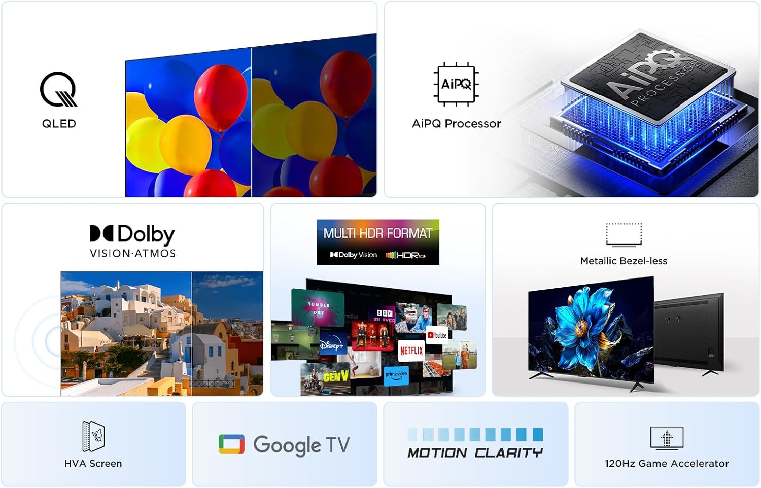 - 【AiPQ Processor】TCL's self-developed AiPQ Processor, incorporates numerous TCL's unique image quality tuning algorithms. This chip has excellent intelligent sensing capabilities and can make pixel-level adjustments to the image quality, thus providing a top-notch viewing experience.