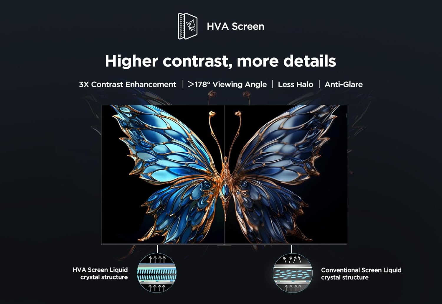 - 【HVA Screen】With innovative technology, HVA Screen effectively emphasizes stronger and more accurate contrast while removing image halo and ambient light interference, presenting a clearer and more detailed stunning picture quality.