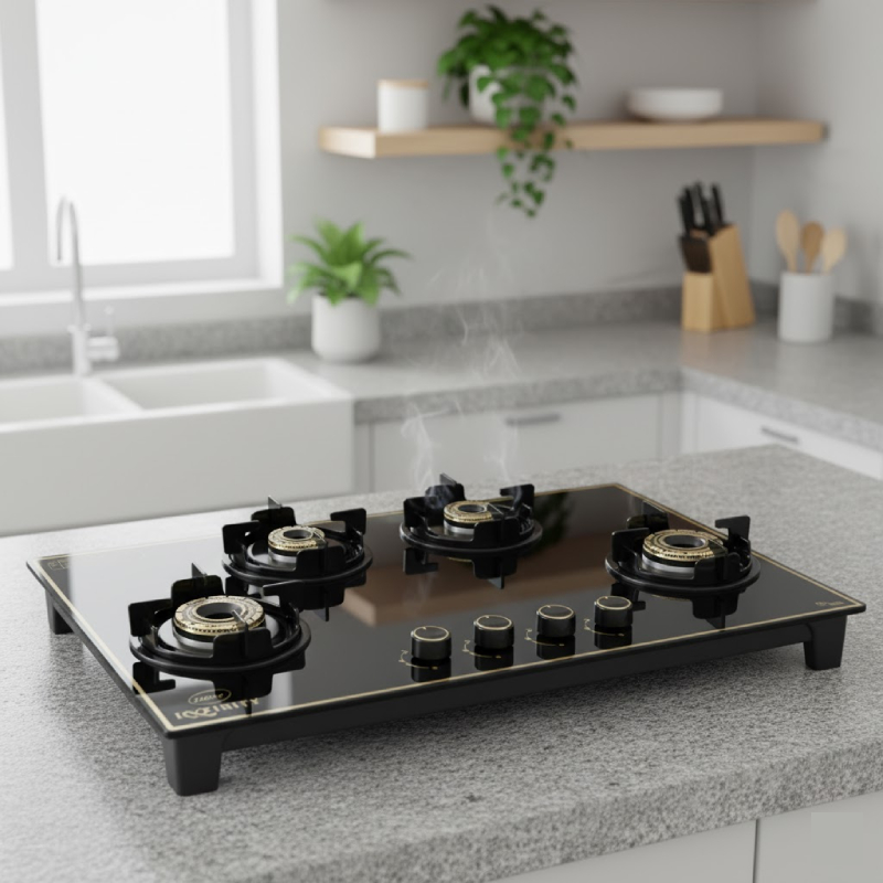 Cook in style with the Pigeon Gas Cooker 4 Burner Infinity Gold (Model: 19004327). Designed with a premium 8mm tempered glass top, it features Titan burners for efficient heat distribution and faster cooking. The sleek gold finish adds elegance to your kitchen while ensuring durability and easy cleaning. Perfect for everyday family meals.