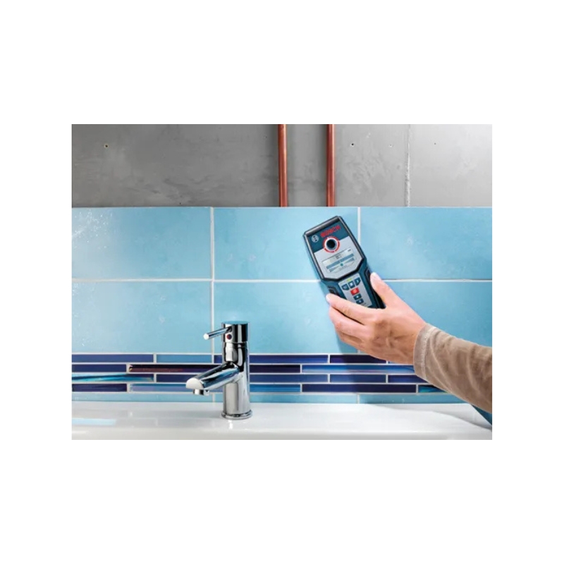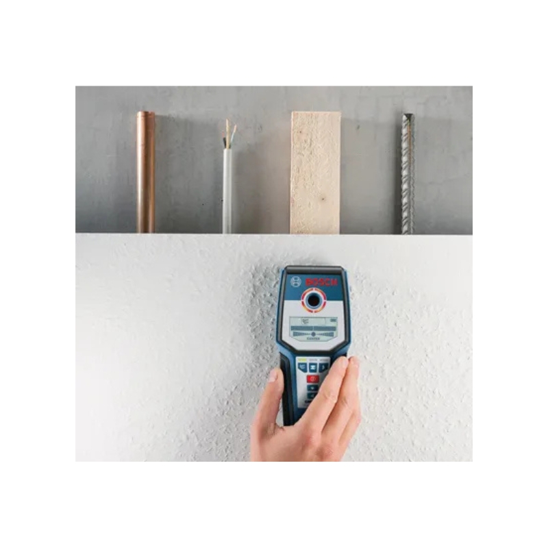 The Bosch Professional Wall Scanner GMS 120 is a reliable multi-mode detection tool designed to identify various materials inside walls, floors, and ceilings. It accurately detects wood studs, ferrous and non-ferrous metals, live electrical wiring and even plastic pipes, making it suitable for renovation, installation and safety-critical tasks. The illuminated ring system provides instant feedback on detection status, while the automatic center finder pinpoints the center of wooden or metal objects for precise drilling or fastening. Its illuminated graphical display further enhances ease of use by showing detection mode, signal strength and object information.