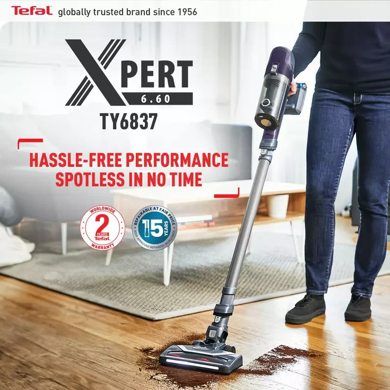 The Tefal X-Force Flex 12.60 Cordless Vacuum Cleaner delivers an all-new cleaning experience—combining exceptional vacuuming performance with ultimate flexibility. The maximum suction power up to 150 Air Watts* ensures efficient cleaning time after time and the slide-in battery offers impressive 45-minute autonomy**. Aqua technology cuts your cleaning time in half with 2-in-1 mopping and dust pick-up, while innovations like automatic suction power adjustment by floor type and the real-time Smart Control Display make cleaning easier day after day.
