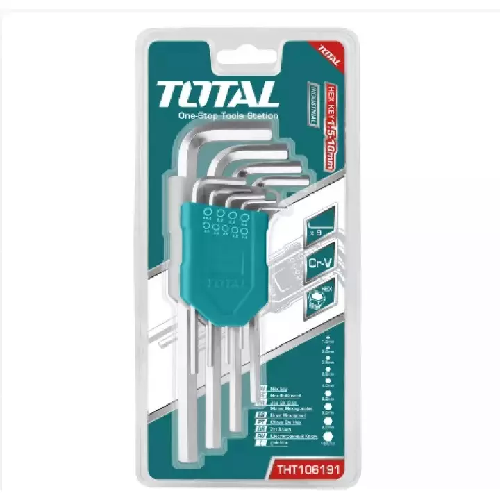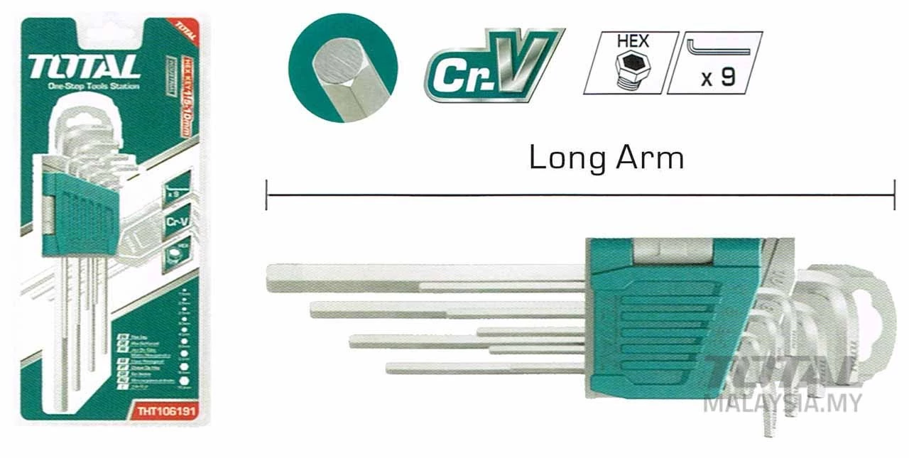 Specifications: THT106191 - Long Arm. Model no: THT106191 Material: Chromium-vanadium steel (Cr-V) Size: 1.5-10mm 9pcs hex key set Heat treatment and chrome plate Packed by double blister