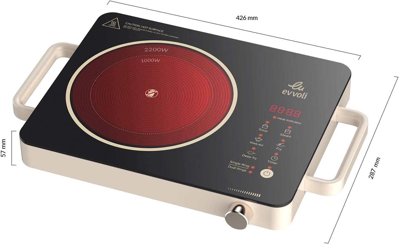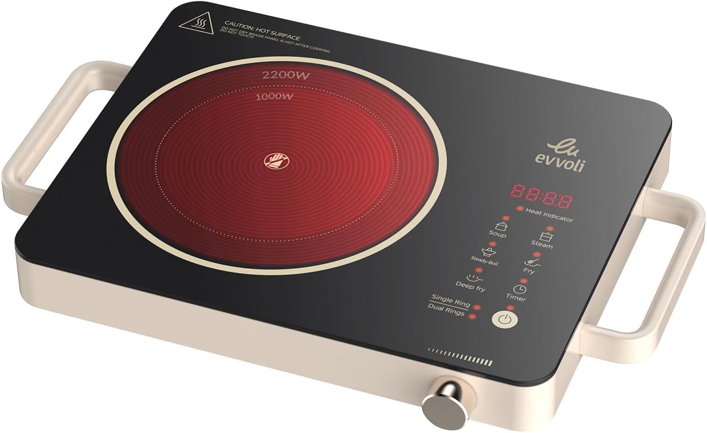 - Quick and Even Heating: Experience rapid and even heating with the Evvoli Ceramic Cooking Hob. Its powerful 2200W output ensures your meals are cooked to perfection, whether you’re quickly boiling water or expertly searing a steak. The 200mm large coil guarantees consistent heat distribution, enhancing the flavor and texture of your dishes.