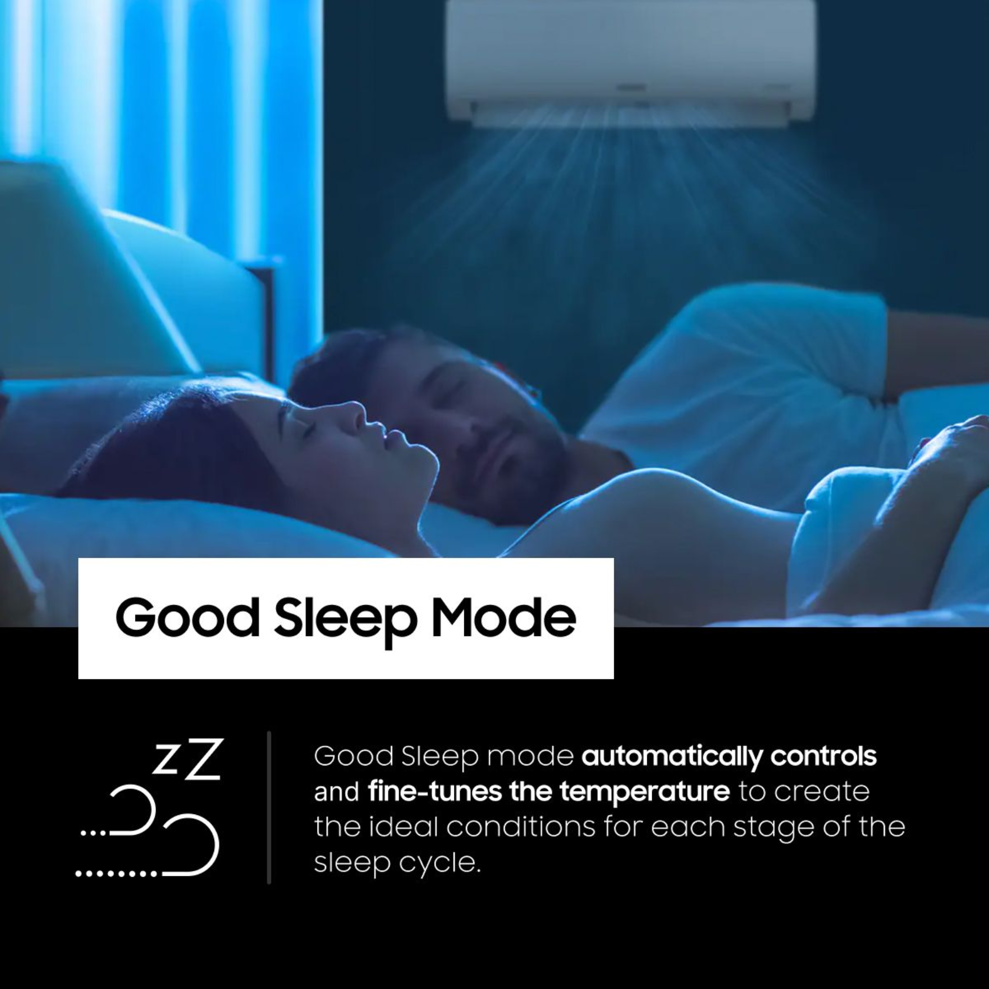 - Good Sleep Mode – optimises temperature and airflow for restful sleep throughout the night.