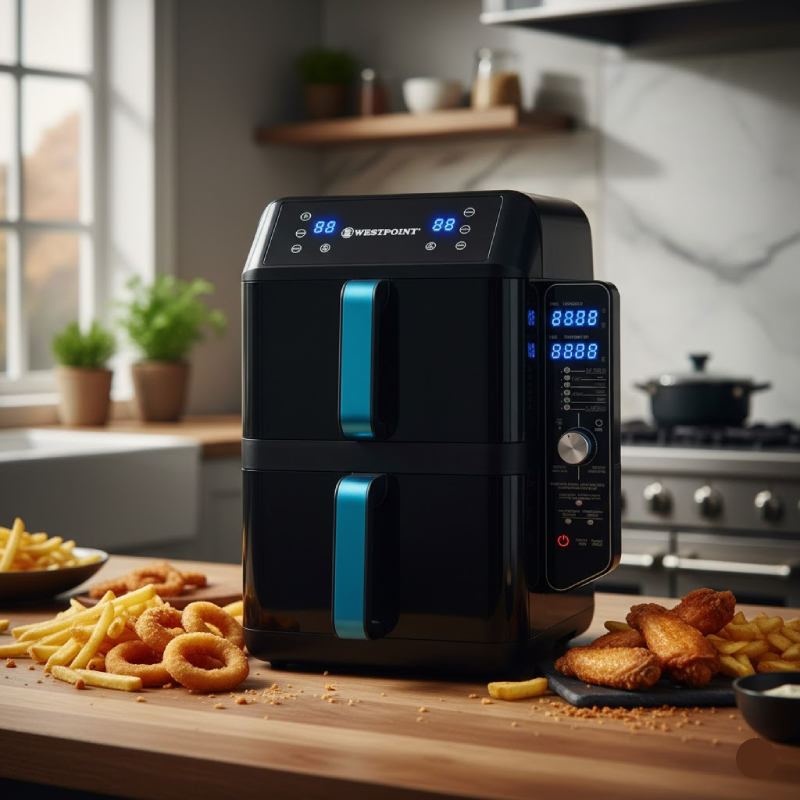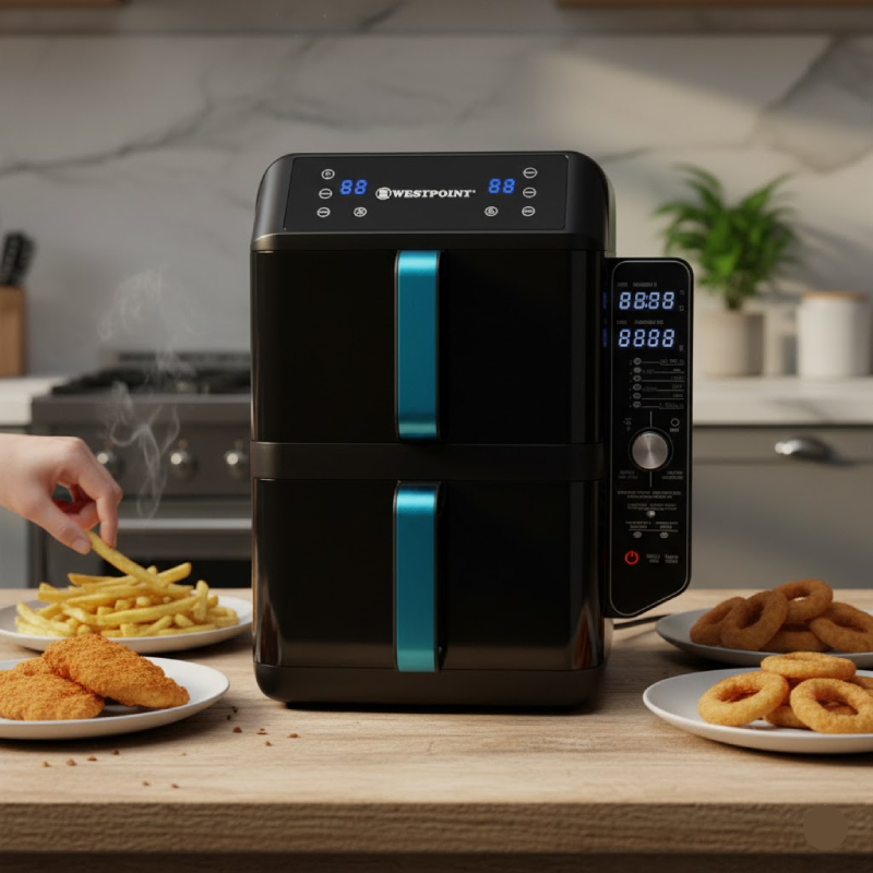 Introducing the WESTPOINT 11L Dual Air Fryer, the ultimate solution for fast, powerful, and healthier home cooking. Featuring innovative Double Cooking technology, this large-capacity air fryer lets you prepare two different dishes simultaneously, making meal prep a breeze for families and entertaining.