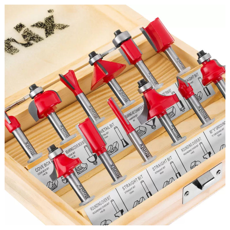 This versatile set includes: "Cove box bit (r=6.35mm), Bearing cove box bit (r=6.35mm), Cover bit (12.7mm), Bearing 45 chamfer bit (C Chamfer bit 45), Bearing flute trim bit (12.7 mm), Straight bit (16mm), Rounding over bit (r=6.35mm), Straight bit (12mm), Straight bit (6mm), Rounding over bit (r=9.5mm), 90 V Grooving bit (12mm), and Roman ogee bit (r=4mm) ". The shank length is 27 ± 5 mm and has a diameter of 6 mm.