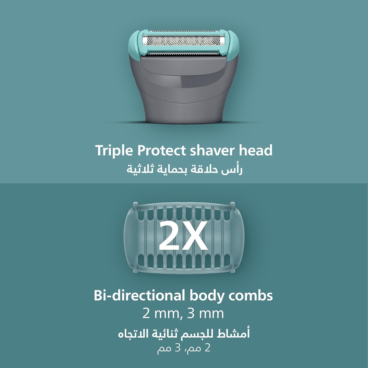 - The two bi-directional click-on body combs (2 and 3 mm) are designed to provide a comfortable trim in any direction across different body areas