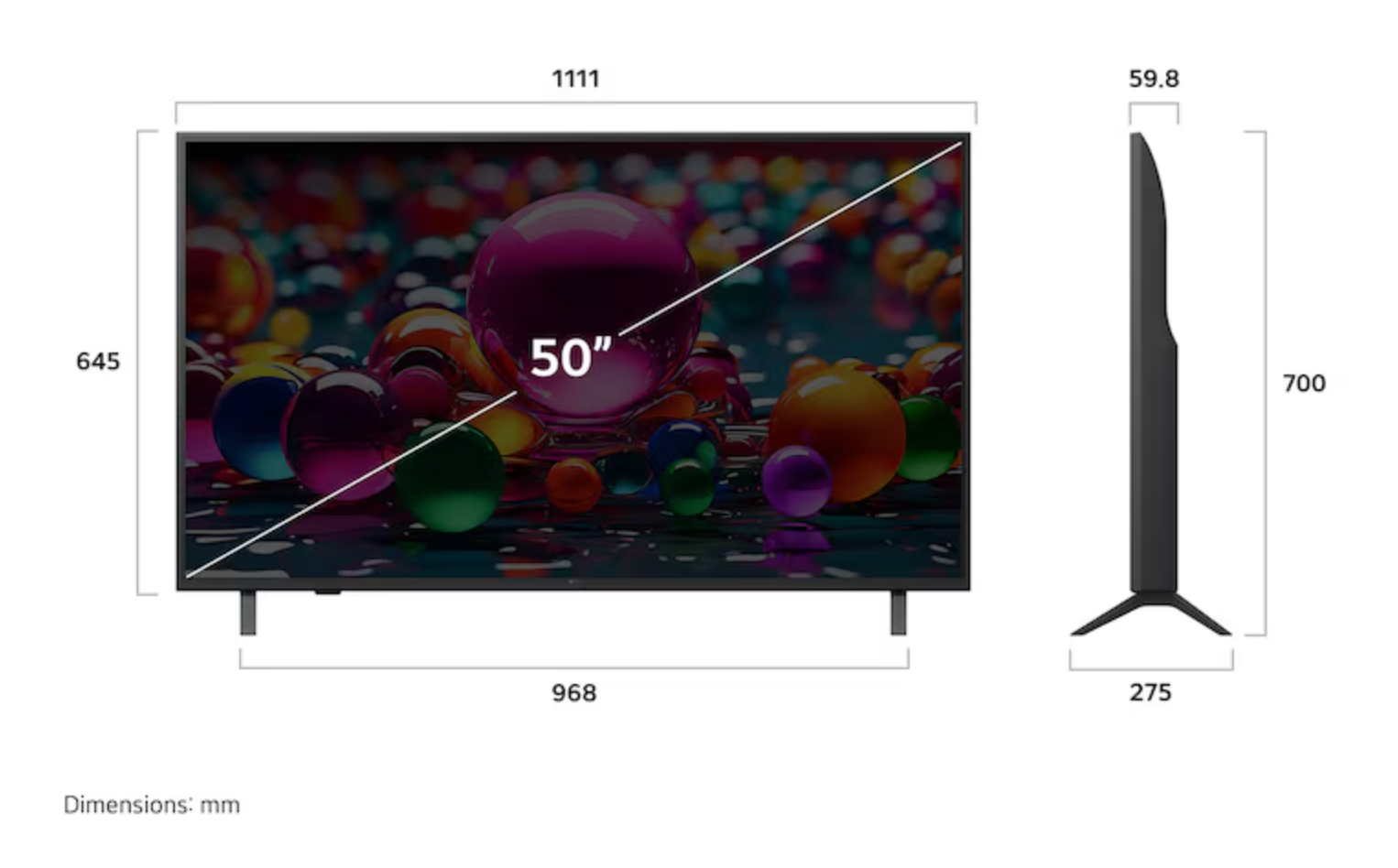 - TV Dimensions with Stand (W × H × D): 1122 × 715 × 231 mm