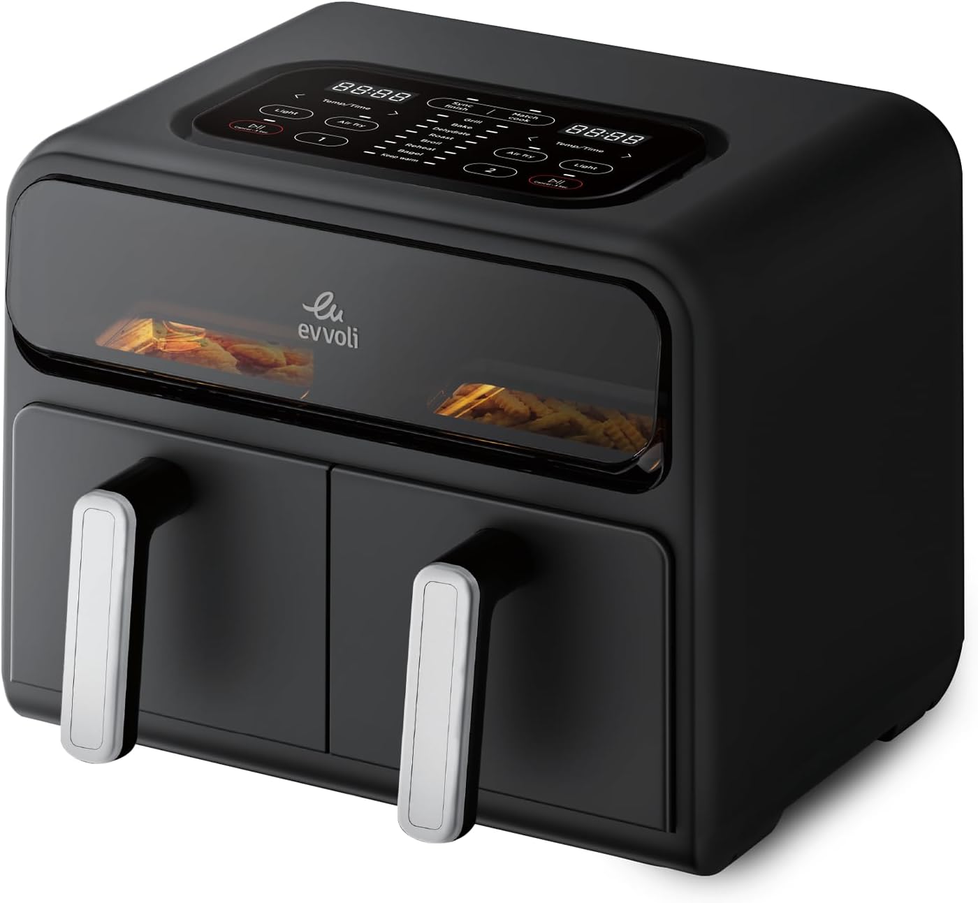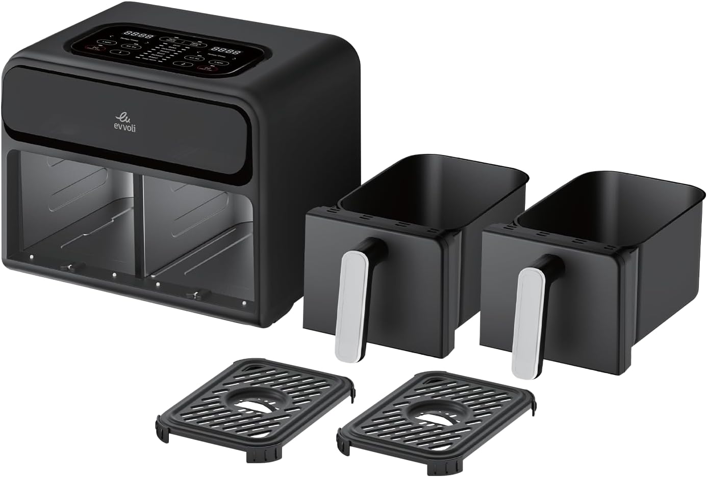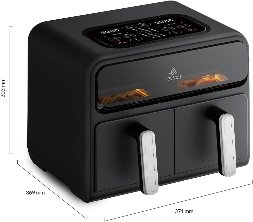- Prepare two Dishes Simultaneously : Cook two different dishes simultaneously with the Evvoli 9L Air Fryer’s Dual Basket Design. Maximize your meal prep by preparing a complete meal faster and more efficiently, with each basket offering separate time and temperature settings
